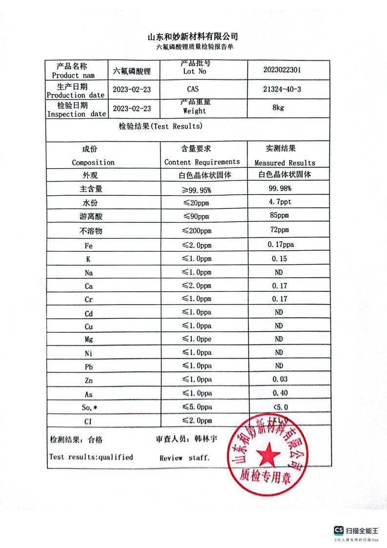 白色結(jié)晶或粉末,相對密度1.50,潮解性強(qiáng);易溶于水,還溶于低濃度甲醇、乙醇、丙醇、碳酸酯等有機(jī)溶劑。暴露空氣中或加熱時(shí)分解。在空氣中由于水蒸氣的作用而迅速分解,放出PF5而產(chǎn)生白色煙霧。